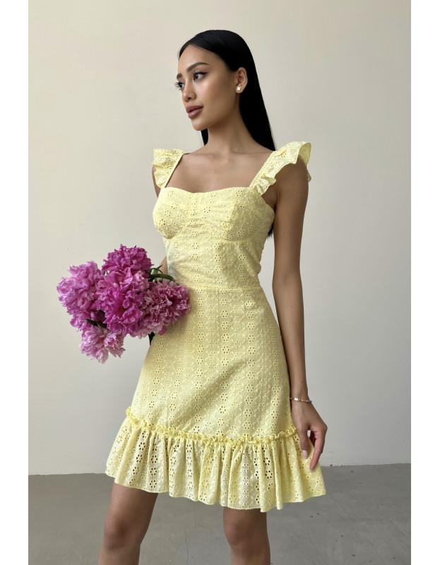 Женственное, романтичное платье из прошвы с подкладкой. Застегивается на удобную молнию сзади. На груди присутствует имитация чашки. Низ платья украшен игривой рюшей. Размеры: 42: бюст 84 см, талия 64 см, бедра 94 см