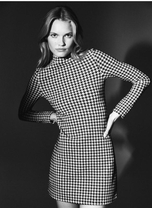 Хлопковая смесь. Жаккардова тканина «гусині лапки». Короткий дизайн. Приталенный крой. Длинный рукав. Высокий воротник. Невидимая застежка-молния сзади.