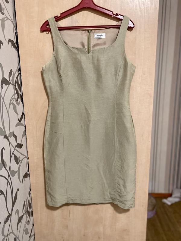 Літня легка офісна сукня, склад: 70% льон,30% шовк Довжина - 90 см Напівоб’єм грудей- 45 см Напівоб’єм талії- 40 см Напівоб‘єм стегон- 50 см Розмір 12 по бірці, ніжний трав‘яний колір