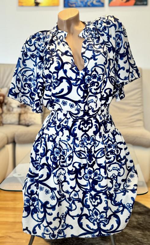 Сукня з легкого матеріалу , ефектний синьо-білий принт у средиземному стилі. Тканина дихаюча, приємна до тіла. Купила во Франції, але потім зрозуміла що не мій розмір. Розмір XS. Додаткові фото можу вислати .