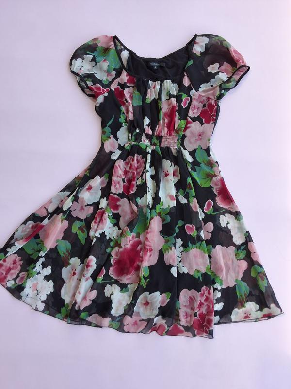 Очень нежное девичье шифоновое платье летающего силуэта. На черном фоне разбросаны крупные розовые цветы. Имеют романтическое настроение. Впереди есть дрпировка, которая присборена на резинку. Рукав: "фонарик". Платье легко комбинируется с любимой летней обувью, включая сапоги. ПОГ - 40 см ПОТ - 36 см Длина - 83 см