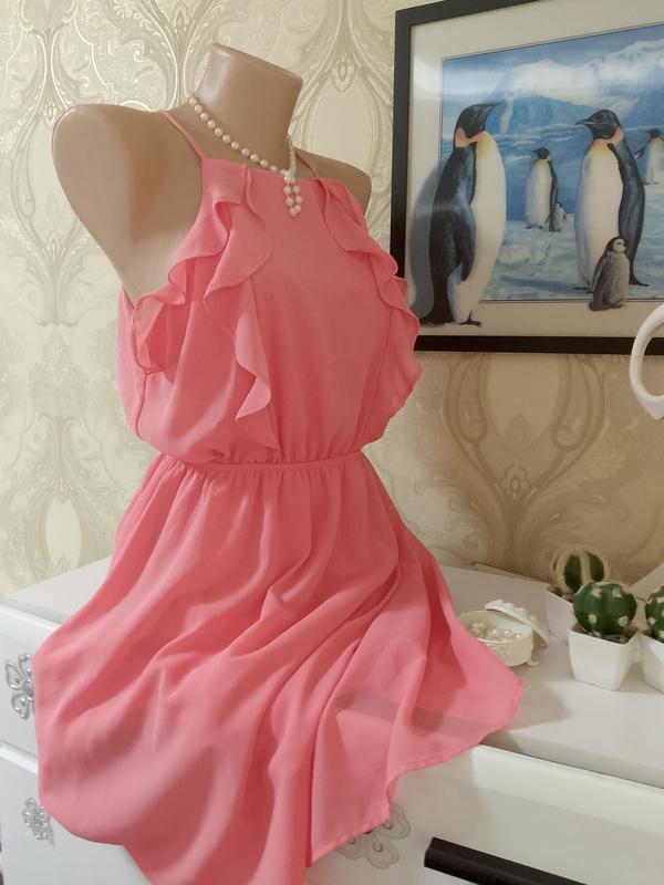 Платье шифоновое на бретельках с рюшами талия на резинке короткая летняя женская/ Monteau. 100% Polyester. Цвет розовый. Оттенок зависит от освещения (теплый/ холодный), более насыщенный. +/- как на первом, последнем фото. Размер указан М. Линия груди 38-46 см. Линия талии 30-46 см. Линия бедер (подкладка) 52 см, тянется больше. Длина от плеча 85 см. Сзади застежка пуговица.