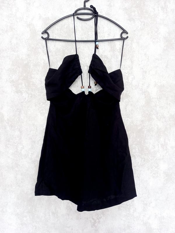 Черное платье из смесового льна от Zara. Завязывается на шнуровку с декором из камушек, молния на спине. платье без подкладки, по бирке размер L.