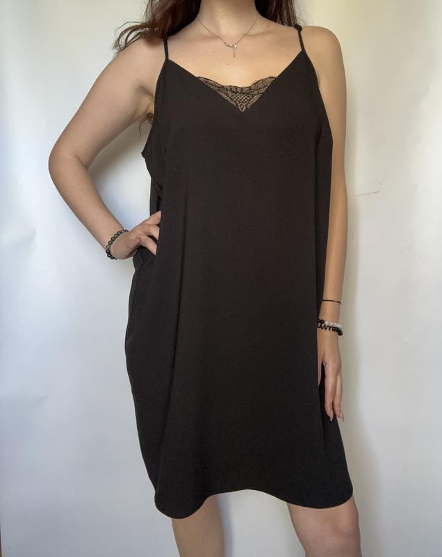 Чорна сукня в білизняному стилі від George. Сукня на бретелях, які регулюється. Стан ідеальний. Оздоблено мереживом. Заміри: Довжина 90-95 см, регулюється бретелями. Пог 54-55 Пот 58 Поб 60-61 Сукня прямого крою Дивіться всі мої оголошення