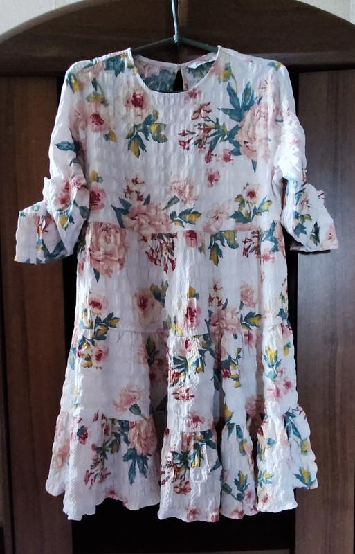 Легкое, как перышко, платье от ZARA в идеальном состоянии. Тканина жатка 98% поліестер 2% еластан Принт из красивых цветов на нежном бежевом фоне. Силуэт расширен к низу, рукава застегивается на манжете, присборенные. Замеры: плечи 39 под руками 50см длина 86см Дополнительные фото и замеры по необходимости. БЕЗОПАСНАЯ ОПЛАТА лишь УКРПОТКА