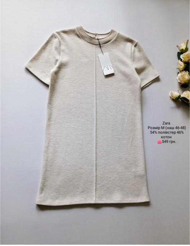 Плаття міні від Zara. Розмір М (наш 46-48). Склад: 54% поліестер 46% котон. Заміри: довжина по спинці 84 см, ПОГ 48 см, ПОТ 48 см, ПОБ 50 см, плече 10 см, довжина рукава 21 см. Стан нового, одягала тільки для примірки. Бірка знята. Може підійти вагітній