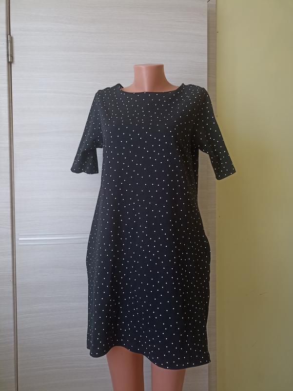 , Сухая в горошок, черно-белая, размер L, (42), трикотажная, из качественной шерсти, не просвечивает, хорошо тянется. Фасон трапеция, подчеркнет бедра и спрячет животик, да есть вытачки в груди Есть два боковых кармана. ПОГ 50 см, ПОТ 49 см, ПОС 60, длина рукава 28, бицепс 18 см, длина по спинке 86 си