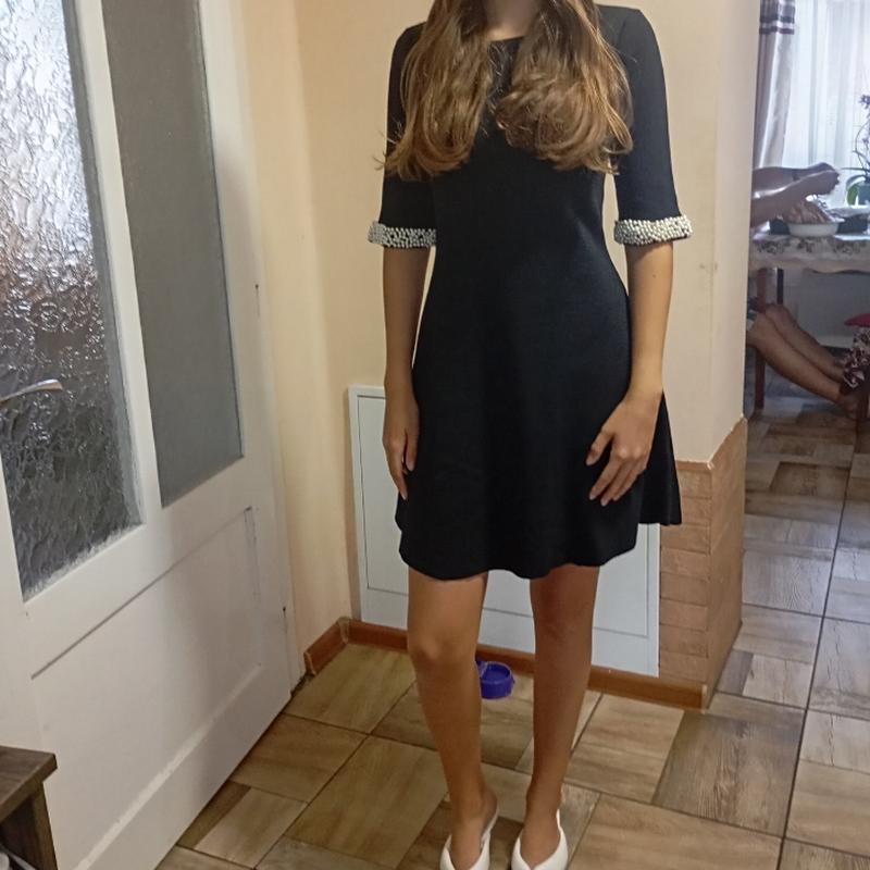 Платье черное трикотажное вязаное с коротким рукавом и украшениями из дома. Размер М. Замеры: ПОГ-44, талия-35, длина -85, рукав-23. Стан идеален. Состав- бирки отсутствует, по мнению полиэстер