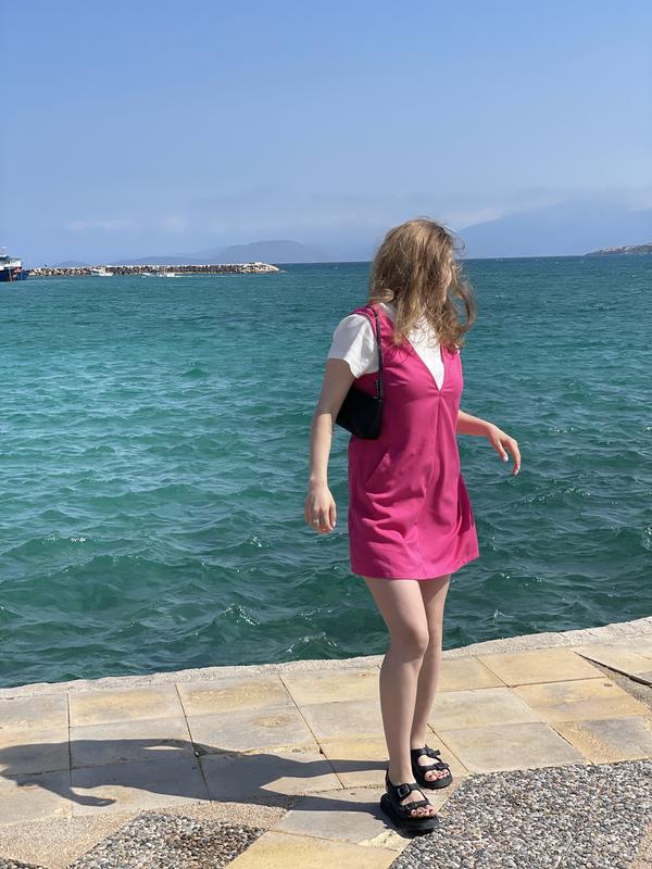 Сарафан яскравого рожевого кольору. Одягала на сорочку чи футболку. Має кишені