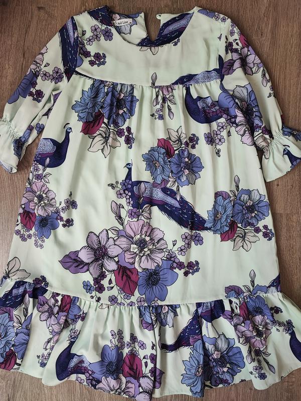 Платье трапеция, метовую котоновую подкладку,в очень хорошем состоянии, размер М, длина -89см, полуобхват под руками-47см,рукав-37см,плече-8см,оборка внизу-20см, 64%полиэстр 33%-вискоза,3%-эластан
