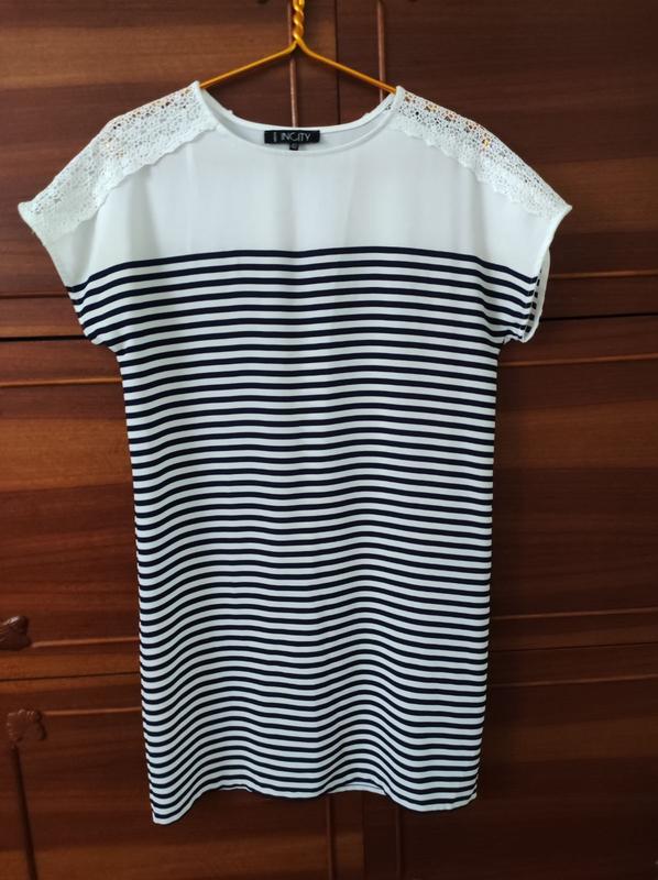 Легкое летнее полосатое платье в идеальном состоянии, без нюансов. Размер - стандартный М. Длина около 90 см, плечо спущенное, ширина под подмышками - около 50 см, платье прямое, так что примерно такая ширина и в бедрах. Легко переться й швидко сохне, не мнеться!