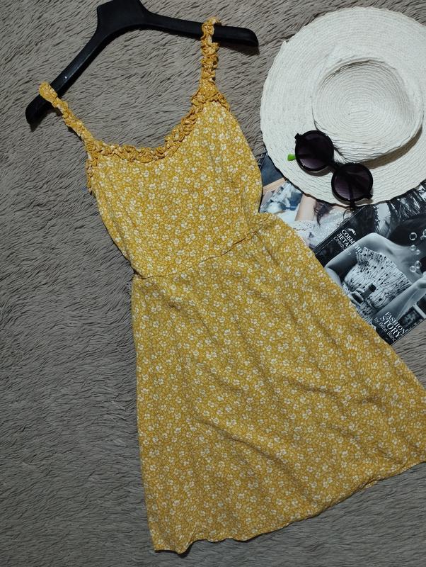 В отличном состоянии. Красивое цветочное платье с юбкой солнце клеш. Тканина легка, не тягнеться. На груди подкладка. На спинке резинка. Размер 8/36/S, но маломерит, смотрите по замерам Замеры (полуобхват): Грудь 36 (тянется до 43) Талия 30(, тянется до 36) Стегна 50 Длина с шлейками 79