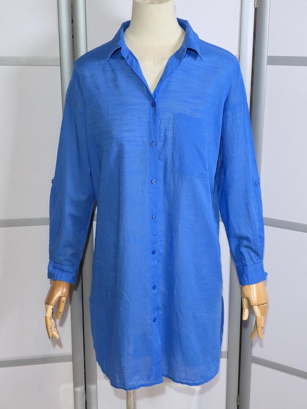 M&Co несирене-синее платье-рубашка туника. 100% хлопок, легкий, качественный Заниженная линия плеча, карман, рукава-трансформеры, разрезы сбоков Идеальное состояние Размер EUR 38 длина от плеча -91/98 полу охват груди -56 талии-56 полу охват бедер-58 от горловины до конца рукава-70 полу охват в бицепсе -23 Возвращение не предусмотрено