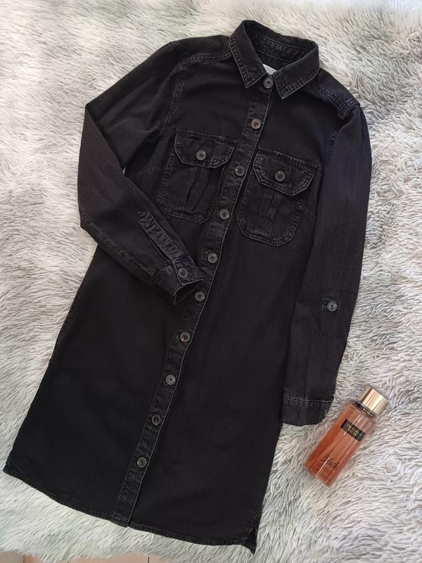 Джинсова сукня сорочка New Look. Размер Xs/S (лучшее замеры). Цвет черный. Рукав можно сделать три четверти. Застегивается на пуговицы. По бокам имеются два прорезных кармана. Спереди на груди два кармана на пуговицах. С двух сторон есть петли под ремень. Материал: 100% коттон. Стан идеален. Дополнительные фото и замеры дамас.