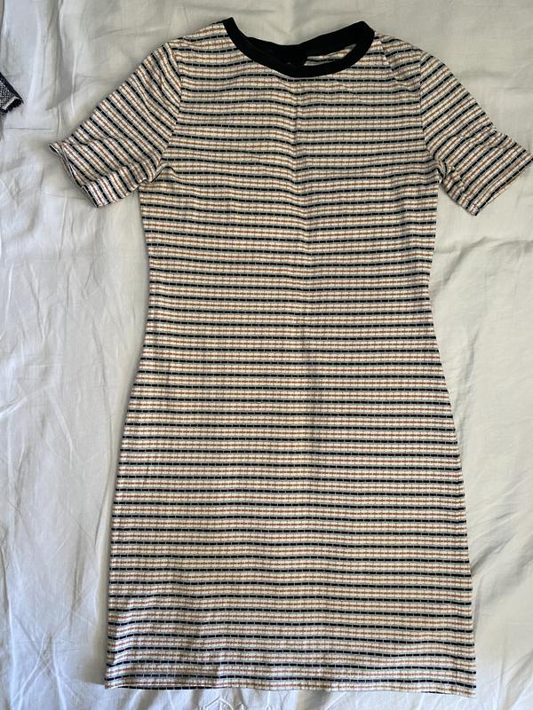 Облягаюча міні-сукня з коротким рукавом, у багатоколірну горизонтальну смужку. Має круглий виріз горловини з чорною окантовкою. Чудово підкреслює фігуру.