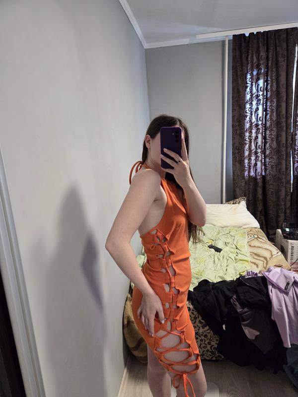 Оранжевое платье со шнуровкой по бокам. Параметри на фото 84/63/100