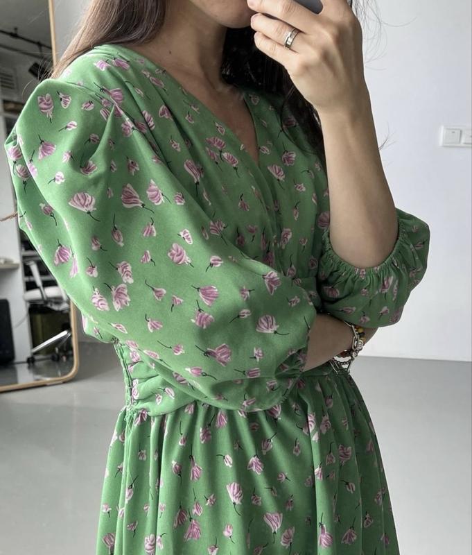 Приємний матеріал, не дешева жарка синтетика. Не просвічує навіть темну білизну. Дуже акуратно зшито, причому у нього складний крій, не просто зшитий з двох сторін шматок тканини. Колір- травʼяний зелений з фіолетовими квіточками. ОГ- 85 ОТ- 66 (але на талії резинка) Довжина рукава- 38 Довжина - 84