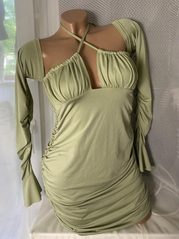 фисташковое платье по фигуре с рукавами открытыми плечами, на см будет хорошо не просвечивает, хорошо тянется