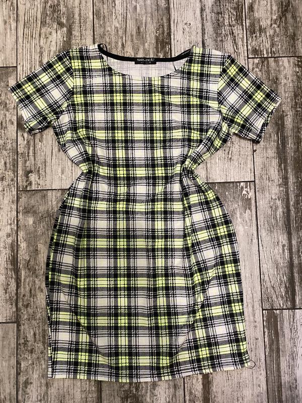 Сукня в густину клітку, в ідеальному стані. Без дефектів. Розмір 16 Заміри : довжина виробу 77.5 см Талія 44.5 см Стегна 49.5 см