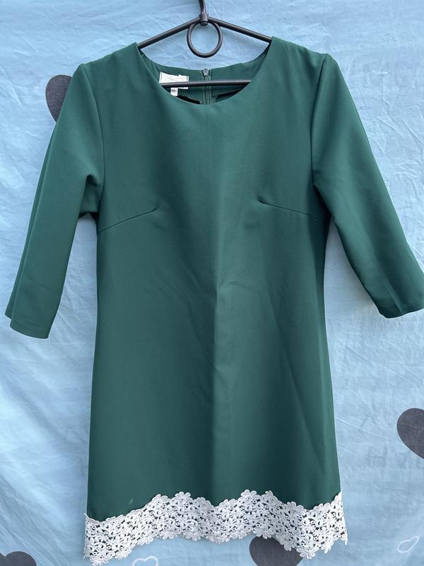Класична сукня А-силуету, внизу оздоблена мереживом , рукав три чверті , легка тканина , що не парить , підійде на різну погоду, глибокий смарагдовий колір