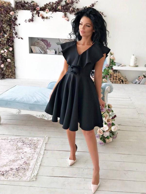 Сукня Модель 1097 340 грн ⬇️ Сукня пишний клеш від талії, довжина міді V-подібне декольте з воланом Блискавка збоку Розмір: чорний 44-46 Тканина: костюмка Колір: чорний Код1905(Алі)