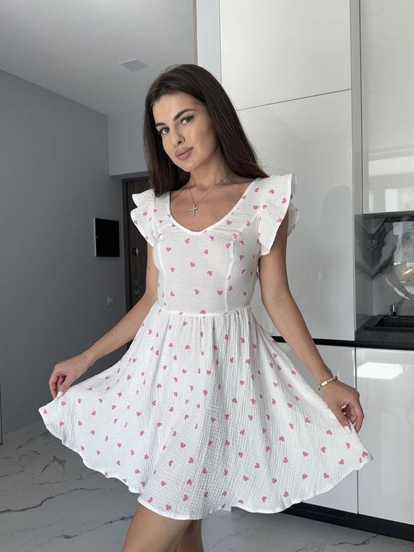 Женское короткое летнее муслиновое платье мини в сердечки с открытой спинкой и бантом