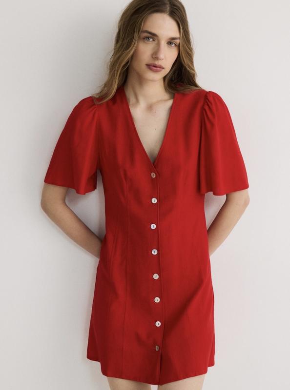 Червона міні сукня злегка розкльошеного крою від бренду reserved. Склад - 70% віскоза, 30% льон. Сукня має: V-подібний викот, короткі, розкльошені рукава та застібку на гудзиках. Стан нової речі, одягала один раз. Заміри: обхват грудей до 86 см, обхват талії до 68 см, обхват стегон до 94 см.