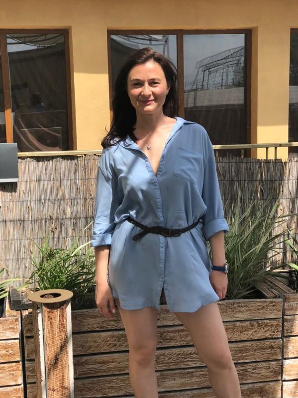 Вискозное платье-рубашка с длинным рукавом, который можно подкачивать, голубого цвета. Идеально как на жаркую погоду, так и на прохладный летний вечер. Прдаю без ременя. Длина 82 см, ширина по низу 68 см, длина рукава 56 см, плечи 56 см. Есть нюансы (добавлены фото), при носке не видно. Одет на рост 165 см, вес 65 кг