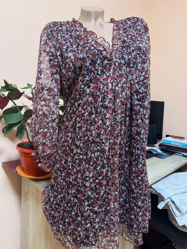Сукня міні виготовлена з легкої невагомої органзи на бавовняному підкладі. Довгі рукави оздоблені тоненькою резинкою на манжеті, що створює чарівний об'єм. Має силуетний крій на талій та вільну об'ємну спідницю, що додає образу грайливості. Ідеальний варіант для вагітних ☺️. Довжина 80 см, в груді 45 см, талія 50 см.