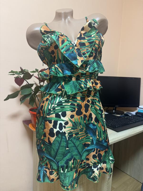Сукня виготовлена з легкої тканини. Має корсетний крій, тонкі бретелі з регуляторами . Чашка прикрашена виточками, що дозволяє комфортніше сідати по фігурі та підкреслює жіночність. По центру корсета декоровано горизонтальними рюшами, лінією з Спідниця внизу доповнена рюшем. Фіксується прихованою блискавкою збоку. Довжина 85 см, в груді 42 см, талія 35 см, стегна 45 см.