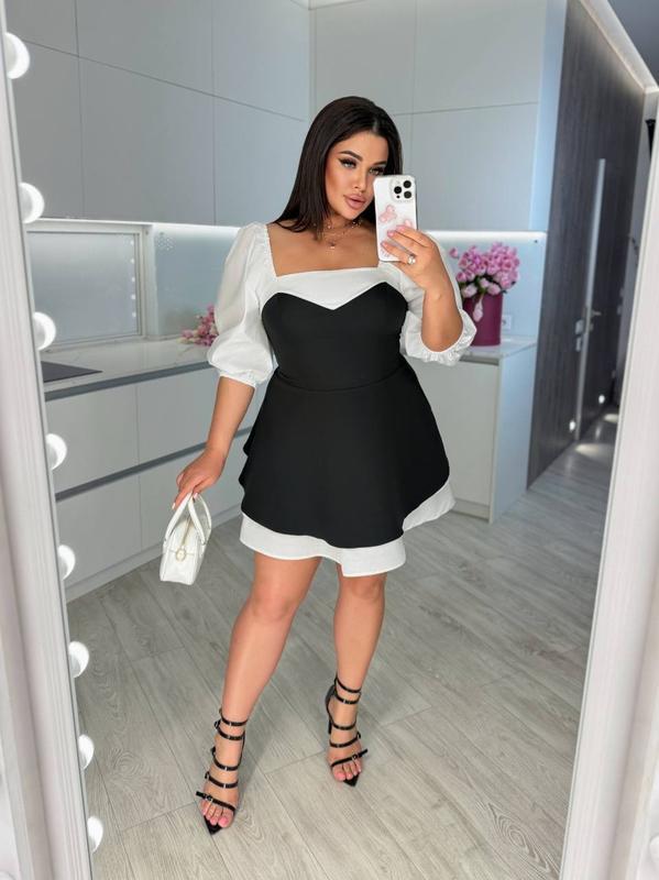 Це підпал! Сукня 😍 ✔️Мод: 240 ✔️Тканина : костюмка, 100% білий котон ✔️Колір: чорний , смарагд ✔️Розміри: 42/44; 46/48; 50/52; 54/56 ☑️ціна: 1150 грн Ця сукня складається з двох основних кольорів. Верх сукні має оригінальний дизайн із комбінацією корсета та білих рукавів. Чорний (смарагдовый) корсет надає елегантності та підкреслює талію, тоді як білі короткі обʼємні рукави створюють романтичний і ніжний вигляд. Пишний білий підклад оброблений кріноліном. Ідеальна сукня для будь яких заходів 💥 Заміри : 42/44 ОГ: 84-86см 46/48 ОГ: 92-96см 50/52 ОГ:100-104см 54/56 ОГ:108-110см Довжина сукні: 95см.А.Е