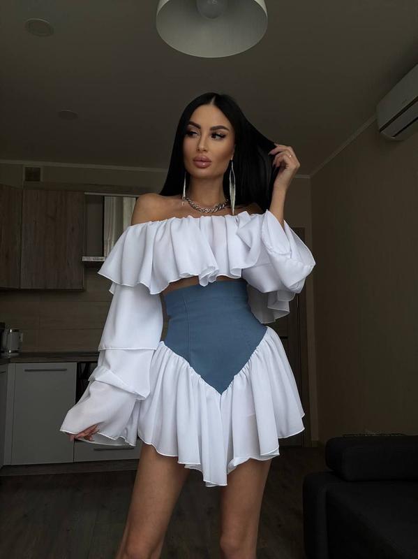 Он просто 🤤🔥 Комплект: блуза + шорты-юбка Фото реал📸 Комплект состоит из многослойной воздушной блузы и шортиков-юбки. Не просвечивает🤍 Мод: 637 . 1486 Ткань: крепшифон + джинс бенгалин Цвет: белый с голубой вставкой Размеры: 42-44, 46-48 Отличное качество! 💸Цена: 1050 грн