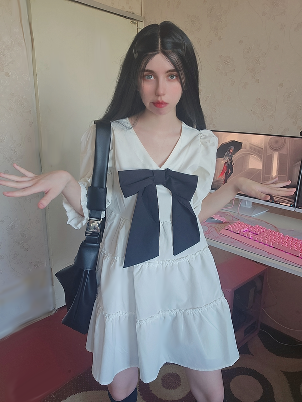 коротка сукня. Модель выполнена из легко струящейся белой ткани с V-образным вырезом и большим черным бантом спереди. 💌 **Особенности:** Цвет: белый с черным бантом * Длина: выше колена * Рукав: 3/4, слегка объемный * Ткань: легкая, приятная к телу (полиэстер/хлопок) 🔮 Идеально подходит для: * Прогулок, фотосессий, встреч с друзьями * Сочетание с гольфами, черными ботинками, сумками на цепочке.