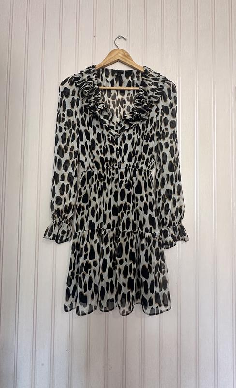 Красивое, нежное платье Леопардовый принт Состояние новой вещи, без следов носки На подкладке( подкладки нет в рукавах и по спинке от талии) Размер S ( на М можно пробовать) Замеры: пог-48см, пот-30см( хорошо тянется), длина рукава-63см, длина по спинке-87см