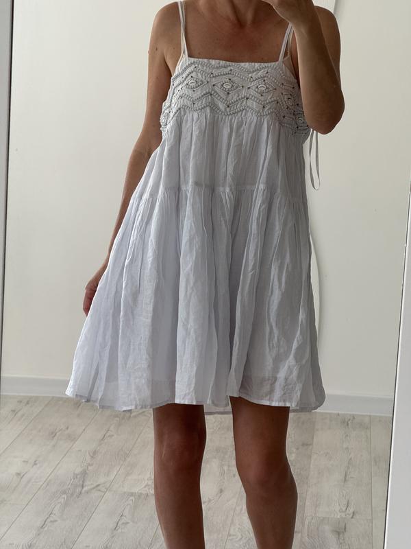 Сарафан со 💯 % хлопка на подкладке, с очень красивой отделкой коло груди, свет голубой цвет, на этикетке указан тоже, воздушный хлопок, указан М, но можно и на л.