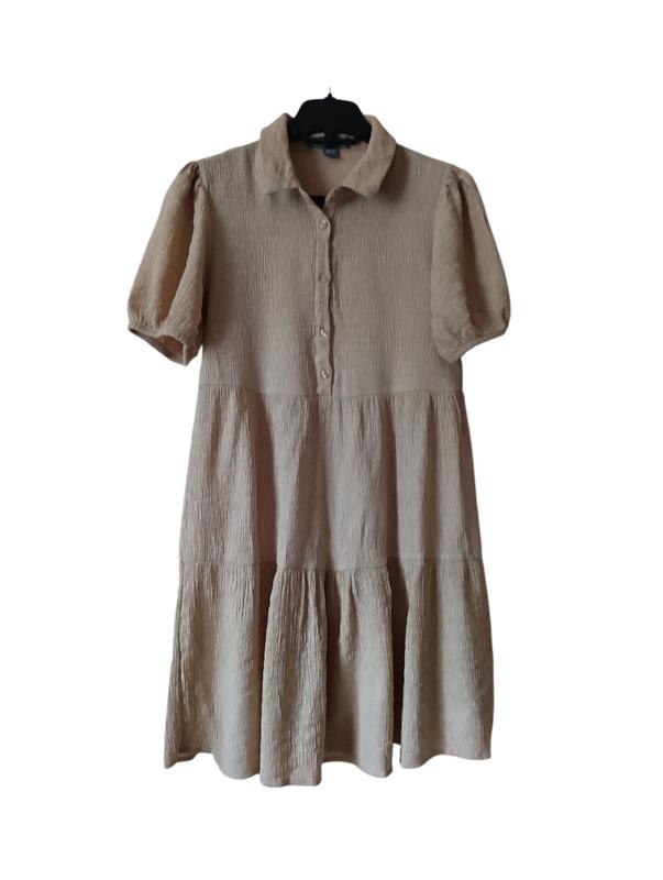 Платье бежево-серое б/у, в красивом состоянии, ткань "жатка" легкая,из вискозы, замеры на фото.На фото не пятно,теннь так легла.