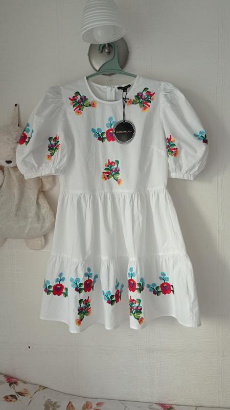 Превосходное нежное платье в этно стиле. Яркая вышивка на белом хлопке. Вад нет, новое с биркой. Но может слегка припиленное, потому что же болтался в магазине на витрине, то желательно постирать, я не стала, потому что же новое) Размер - M, но и на S выглядит отлично. Плечи - 34, подмышками - 49, талия - 40, бедра - свободно, длина - 41+46. Общая - 87.