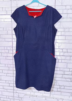Плаття в мілкий горох з кишенями Спинка декорована великими червоними ґудзиками Розмір вказано 56(укр) Склад тканини не вказано , тягнеться, не тонка Довжина 96 Пог 55/60 Поб 55/62