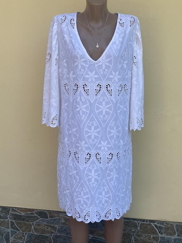 Классное платье из прошвы, 100% Коттон,, размер указан М, крой свободный, длина 92см, грудь 100-105см, бёдра 105см, цвет Айвори