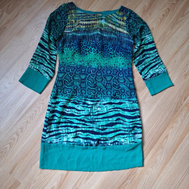 Легкое яркое платье с подкладкой, спинка украшена пуговицами и бантом.