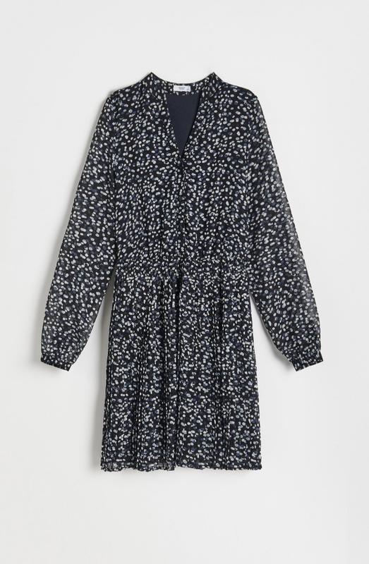 Платье с v-образным вырезом, с полупрозрачными рукавами, с плиссированной юбкой. Новая, с бирками. Почти незаметная затяжка на плече, необходимо пришить 3 пуговицы.