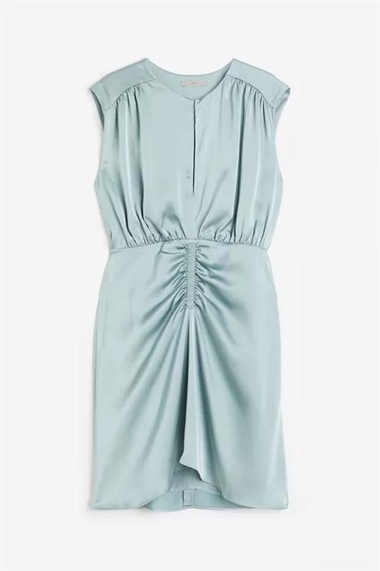 100% полиэстер Платье из драпированного атласа. Платье длиной до колена и без рукавов из мягко драпирующегося атласа. Круглый вырез и застежка на потайную пуговицу спереди. Лиф со сборными швами на плечах и спине. Узкая эластичная резинка на талии и эластичная деталь на юбке спереди для эффекта драпировки. Потайная застежка-молния с одной стороны. На подкладке. Ширина плеч 45см, полуобхват груди 50см, длина изделия 90см.