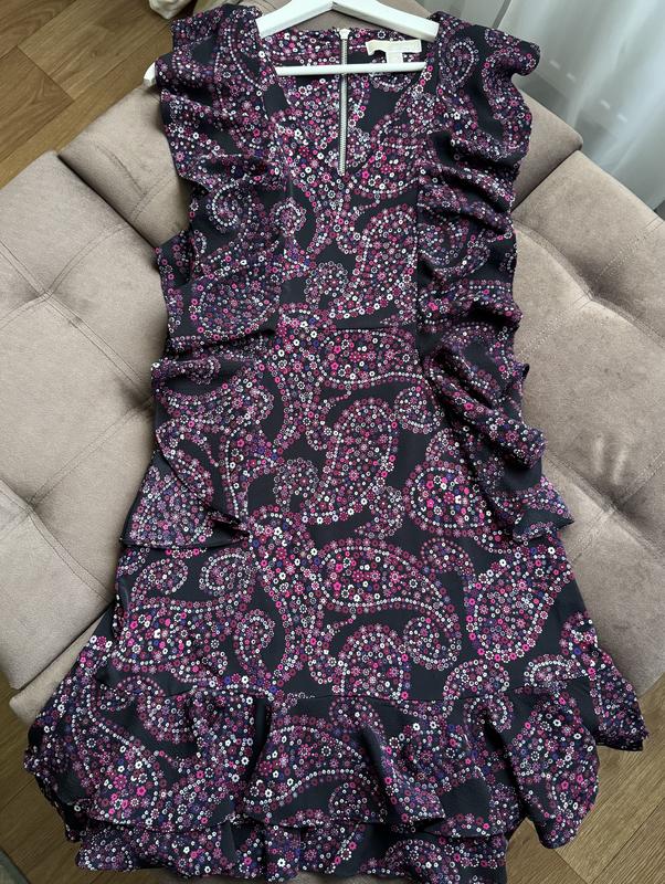 Неймовірно красива квіткова сукня від відомого бренду Тканина гарно тягнеться, нічого не просвітлює За рахунок вертикальних воланів класно коректує фігуру Розмір вказано S, але легко гарно сідає навіть на М Брендована фурнітура