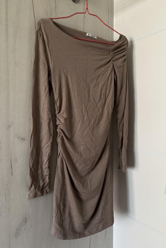 Сукня у бежевому кольорі з подовженими рукавами, на одне плече. Стан нового 🔥. Приємна тканина до тіла. Гарно тягнеться. Розмір: М
