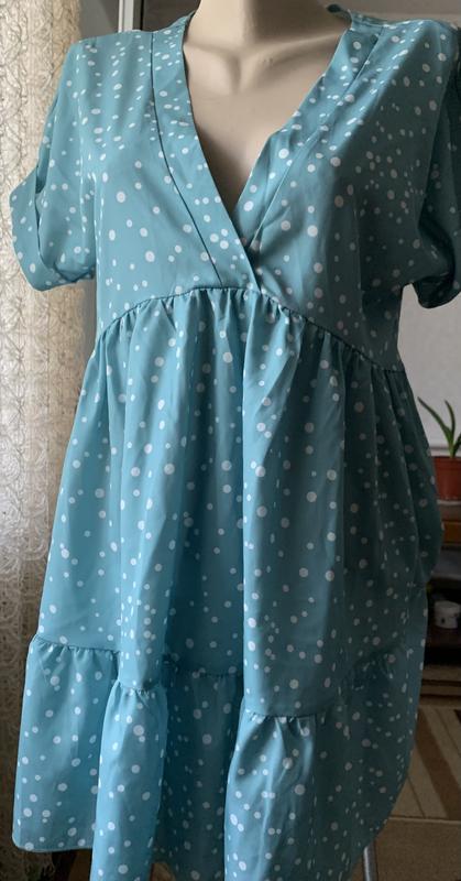 Новое ярусное платье свободного кроя в горошек. Купила на размер s, тоже хорошо подходит. Заказывает как пляжную и для прогулок. Жодного разу не вдягала, нажаль. Цвет нежно -бирюзовый, очень красивый. Можно добавить тонкий ремешок по желанию. Длина 81, ПО под рукавами 50 см, ОБ - свободно. Тканина тонка, шовковиста на дотик, не тягнеться.