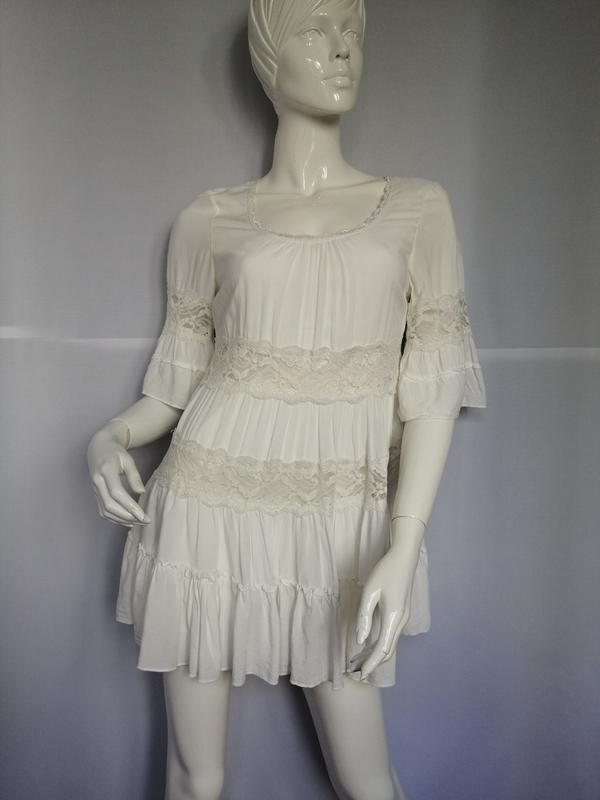 Короткое милое платье белого цвета. На размер XS-S. На невысокий рост где-то до 160 будет хорошо. Дополнительные фото и замеры по запросу.