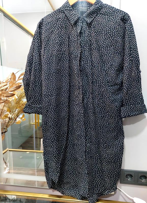 Легкое платье сорочка черная в белый горошек в размере М(38) от бренда Selected femme.Фасон оверсайз.Подойдет и на размер S и L.Ткань очень приятная к телу 100% хлопок.Стильно смотрится на фигуре.Можная одевать как платье, рубашка или в растедутом виде как легкий кардиган.Спереди по всей длине застегивается на пуговицы.В идеальном состоянии.Рукава можно подкачивать.По бокам вырезы.Длина спереди 91 см а сзади 102 см, Линия плеча опущена.Довжина рукава от воротника 74 см,ПО в груди 63 см,ПО в талии 56 см. К низу прямой.Можная одевать под пояс.Будет выглядеть тоже красиво.