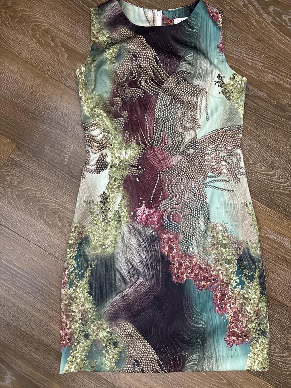 Шикарное платье Правильной длины 92см Немущаяся ткань Изумительная расцветка Дорого и стильно смотрится Есть подкладка Пог 47 Замок на спинке