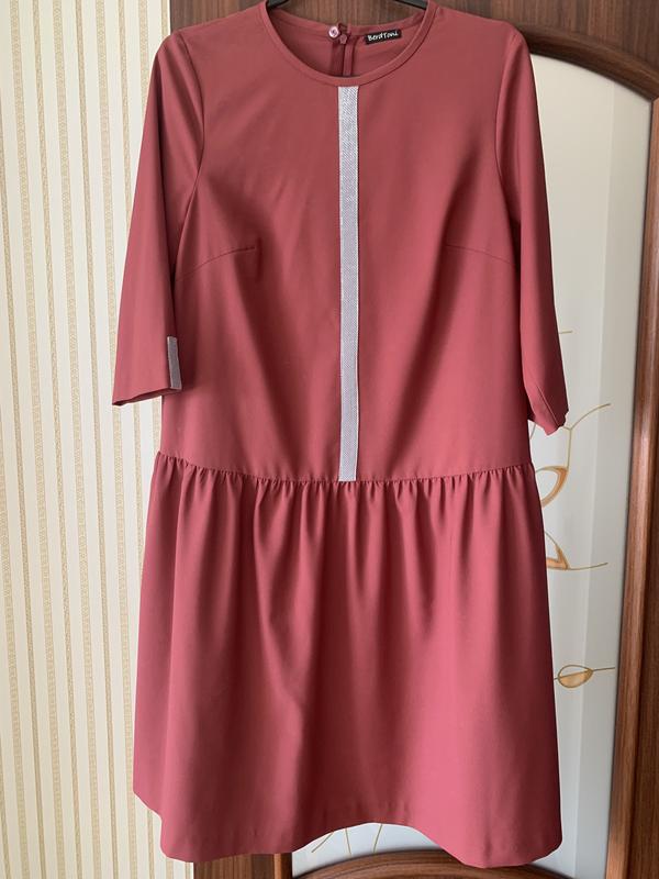 Сукня вільного крою, на спині змійка, декороване сріблястими полосочками попереду і на рук...