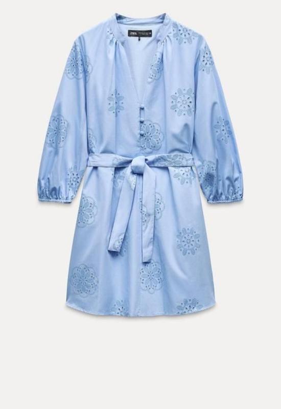 Короткое платье из поплина с прорезиненной ажурной вышивкой с вырезом «замковая скважина» и рукавами длиной ниже локтя. Эластичные кромки, пояс из той же ткани.Застегивается на пуговицы в тон. размер M Нове, без бірок❗ Плечи- 39 см НОГ- 53 см НОБ- 68 см Длина рукава- 49.5 см Длина платья по спинке- 87.5 см
